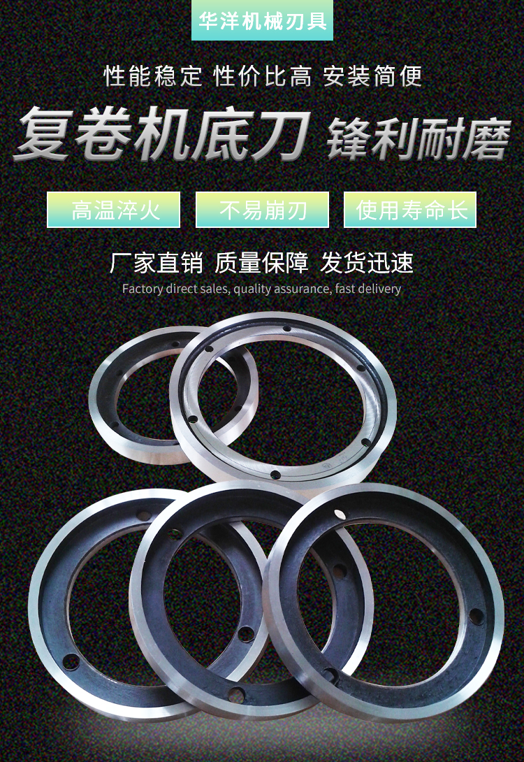 該復(fù)卷機刀片由復(fù)卷機上刀(分為碟形刀和平圓刀兩種類型)和復(fù)卷機底刀(分為碗刀和多刃刀圈兩種類型),采用加工中心、數(shù)控車床、數(shù)控鉆床、數(shù)控精磨、數(shù)控圓盤磨床、數(shù)控內(nèi)外圓磨床等一系列數(shù)控機械設(shè)備精密加工,并采用真空爐對刀片全身做高溫?zé)崽幚恚镀哂星懈钿h利、切割精度高、機械性能好、使用壽命長等優(yōu)點。